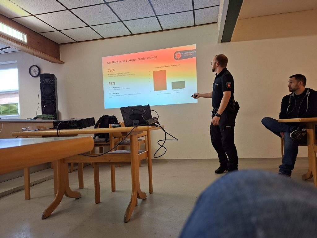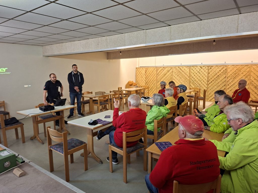 Mit dem Anruf beim Sender war es nicht getan. ´Schorse´, der Moderator von NDR1 setze sich in sein mobiles Studio und Richtung Hemmoor in Bewegung – voraussichtliche Ankunftszeit für die Gewinnübergabe: 09:45 Uhr. Nun galt es, in gut 2 Stunden genügend Vereinsmitglieder für einen gebührenden Empfang zu mobilisieren. Respekt: gut 30 Mitglieder unterbrachen ihre früh morgendliche Tätigkeit, zogen Vereinskleidung an und machten sich auf den Weg zum Güterschuppen, dem Vereinslokal. Natürlich ließ auch Melanie, Wirtin vom Güterschuppen, sich dieses Event nicht entgehen. Schorse und Begleitung waren nahezu pünktlich – Kurze Begrüßung, und schon wurde Ton- und Bild-Equipment herausgeholt, denn in wenigen Minuten sollte es eine Life-Schalte ins Studio geben. Noch einmal kurz die Jubelszenen geprobt – und schon war der Radsportverein „on air“. 90 Sekunden dauerte der Spot mit Interview, Gewinnübergabe und den zuvor geprobten Jubelschreien. Schorse hatte Routine im Ablauf und die 30 Radler sorgten für eine perfekte Stimmung. Auch eine Bildaufnahme durfte nicht fehlen – für die abendliche regionale TV-Ausstrahlung. Also: noch einmal Interview und noch einmal Jubeln – perfekt – uuuund Klappe! – alles im Kasten.