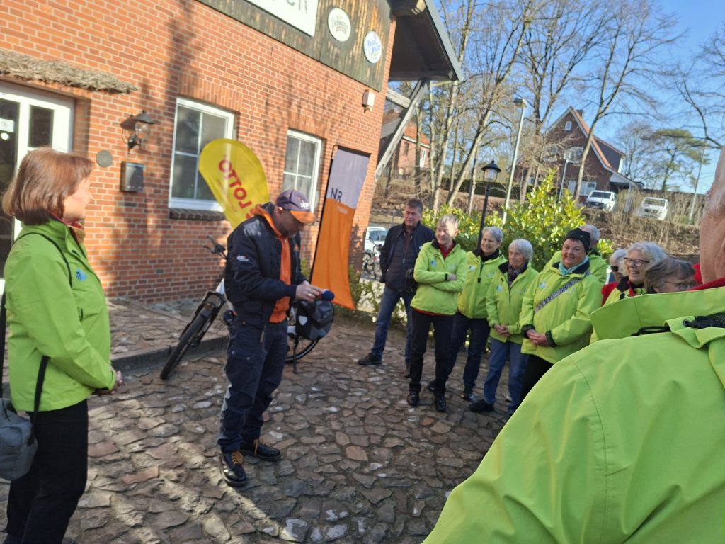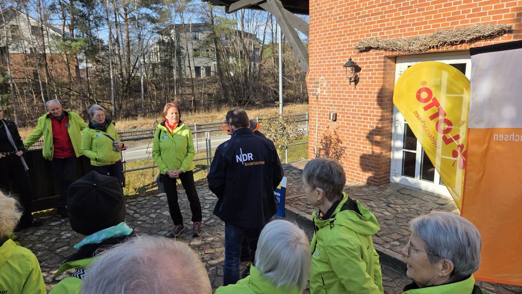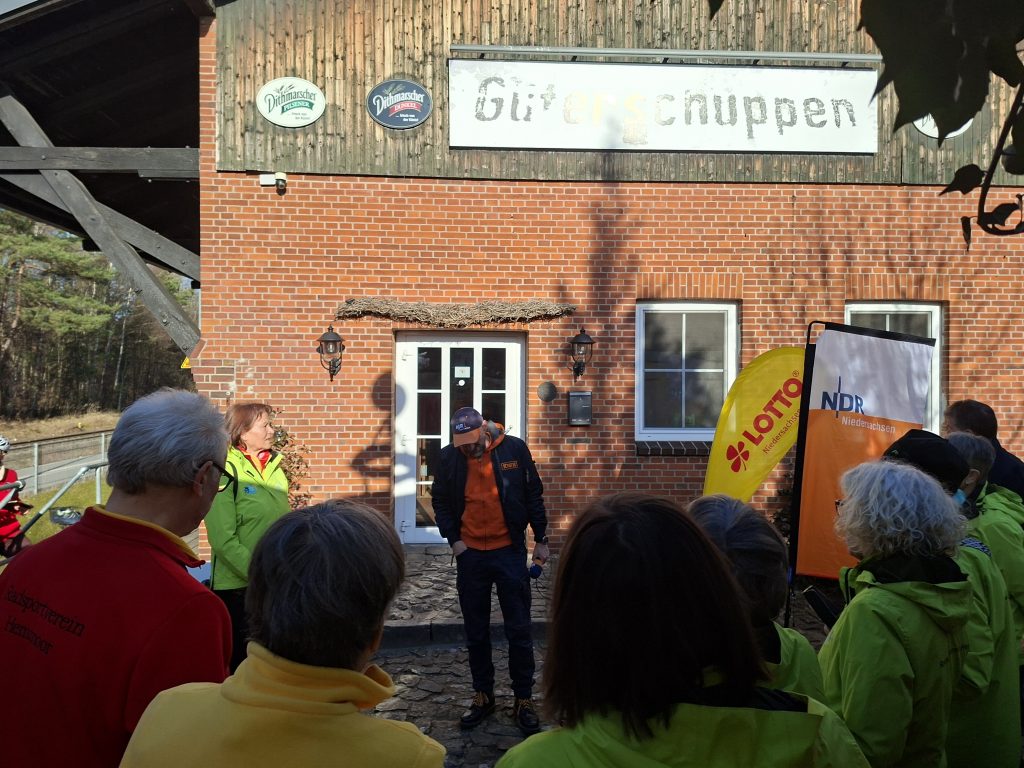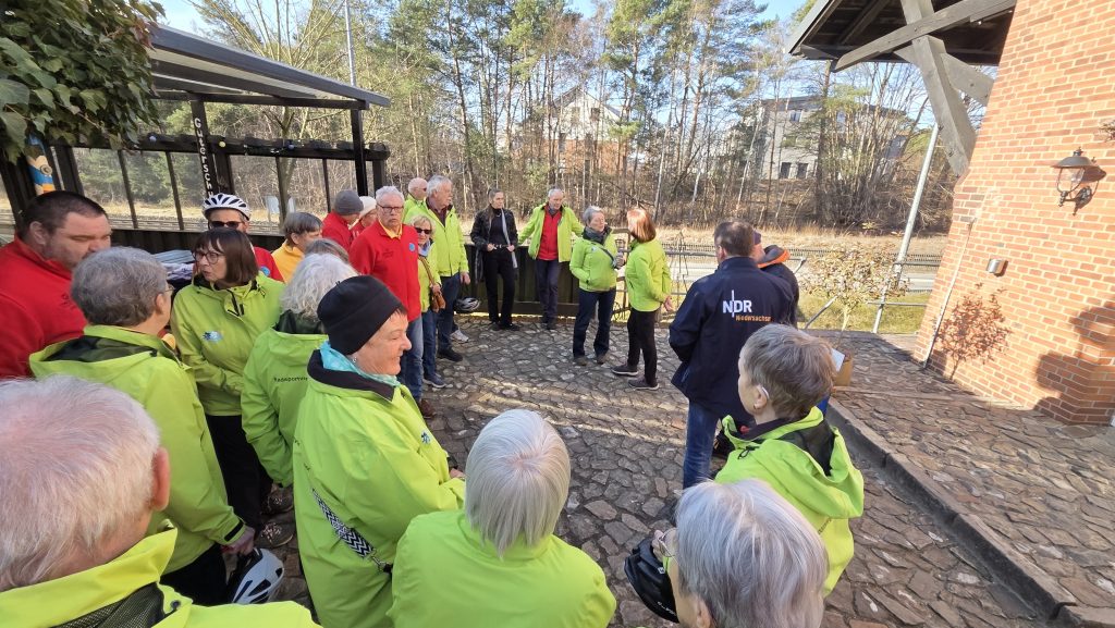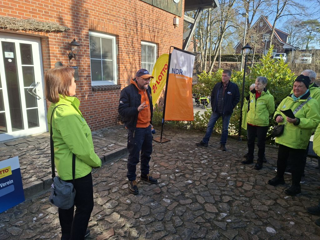 Mit dem Anruf beim Sender war es nicht getan. ´Schorse´, der Moderator von NDR1 setze sich in sein mobiles Studio und Richtung Hemmoor in Bewegung – voraussichtliche Ankunftszeit für die Gewinnübergabe: 09:45 Uhr. Nun galt es, in gut 2 Stunden genügend Vereinsmitglieder für einen gebührenden Empfang zu mobilisieren. Respekt: gut 30 Mitglieder unterbrachen ihre früh morgendliche Tätigkeit, zogen Vereinskleidung an und machten sich auf den Weg zum Güterschuppen, dem Vereinslokal. Natürlich ließ auch Melanie, Wirtin vom Güterschuppen, sich dieses Event nicht entgehen. Schorse und Begleitung waren nahezu pünktlich – Kurze Begrüßung, und schon wurde Ton- und Bild-Equipment herausgeholt, denn in wenigen Minuten sollte es eine Life-Schalte ins Studio geben. Noch einmal kurz die Jubelszenen geprobt – und schon war der Radsportverein „on air“. 90 Sekunden dauerte der Spot mit Interview, Gewinnübergabe und den zuvor geprobten Jubelschreien. Schorse hatte Routine im Ablauf und die 30 Radler sorgten für eine perfekte Stimmung. Auch eine Bildaufnahme durfte nicht fehlen – für die abendliche regionale TV-Ausstrahlung. Also: noch einmal Interview und noch einmal Jubeln – perfekt – uuuund Klappe! – alles im Kasten.